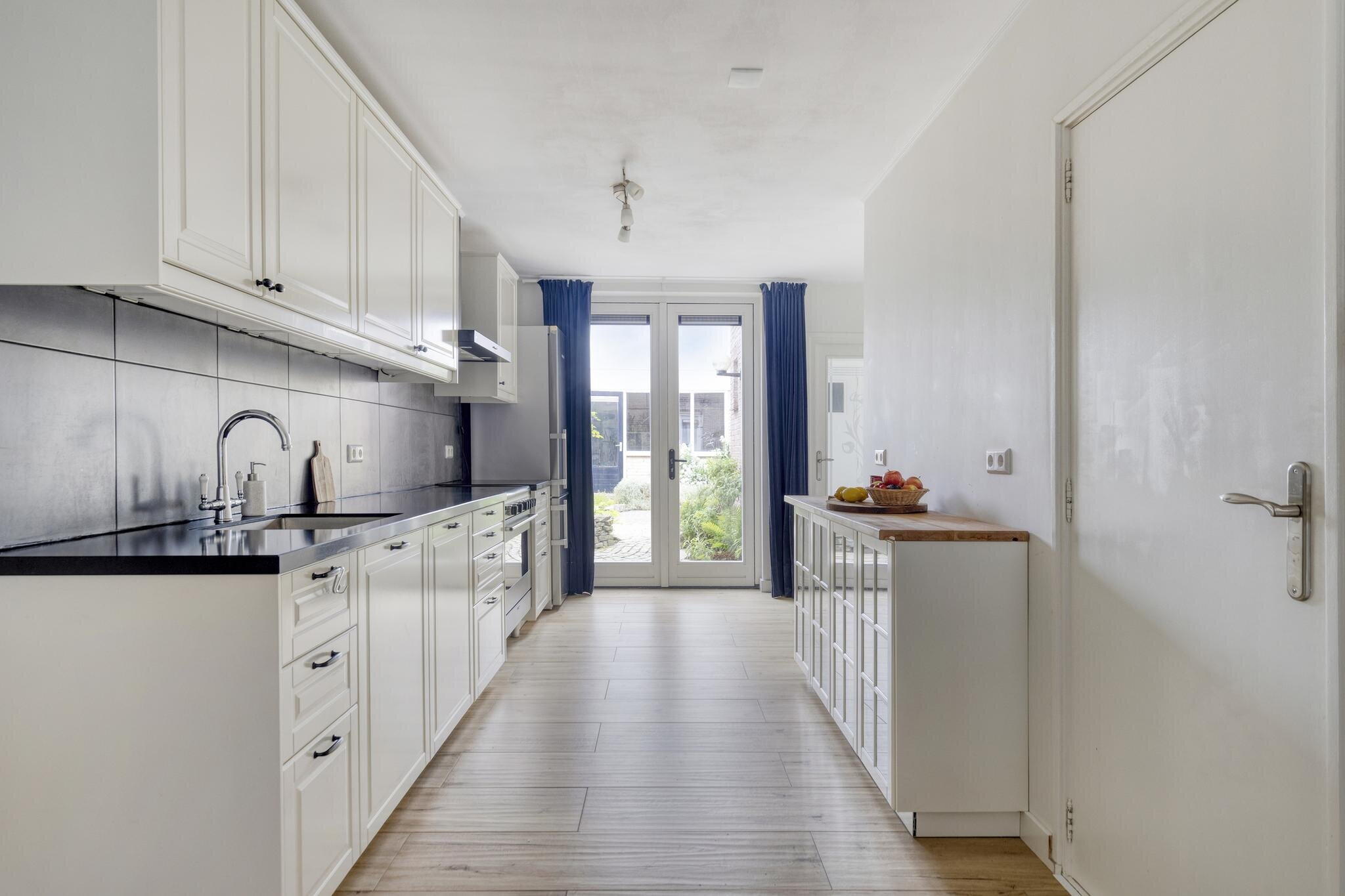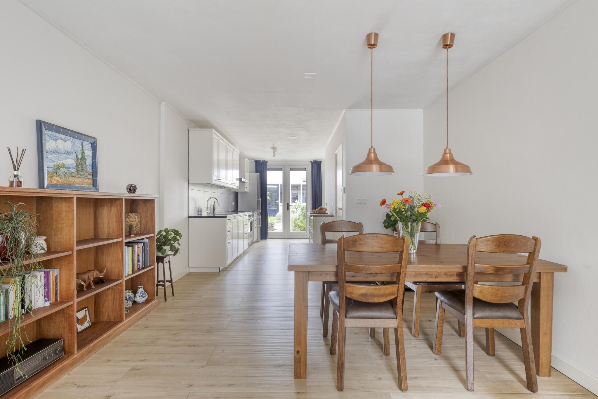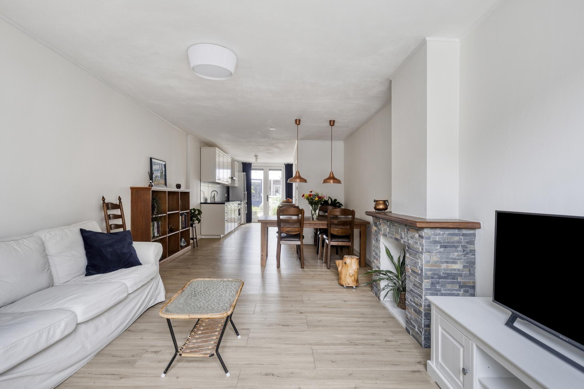 De woonkamer is een heerlijke plek om thuis te komen. Dankzij de lichte vloer, witte muren en grote raampartijen baadt deze ruimte in het daglicht. De gezellige schouw voegt karakter toe en de indeling maakt het eenvoudig om een comfortabele zithoek én eethoek te creëren. Aansluitend vind je de open keuken met witte kastjes, grijze tegels, en complete inbouwapparatuur. Hier kook je met plezier – en met zicht op de tuin. Extra handig: een trapkast voor extra opbergruimte én een deur naar de tuin. Via de keuken bereik je ook een gang met het toilet en een tweede deur naar buiten. De trap naar boven is slim weggewerkt achter een deur.
