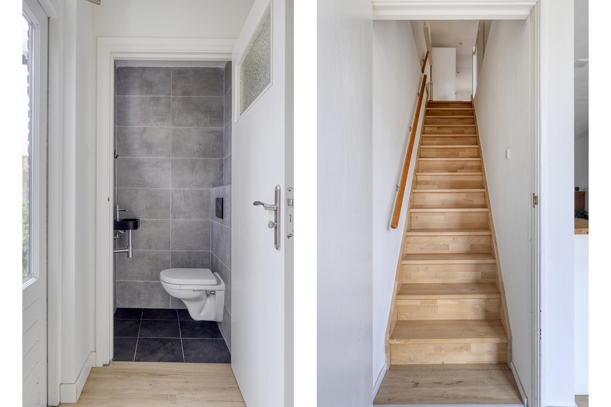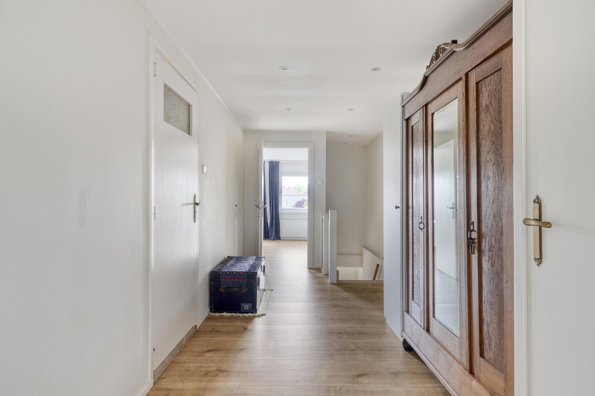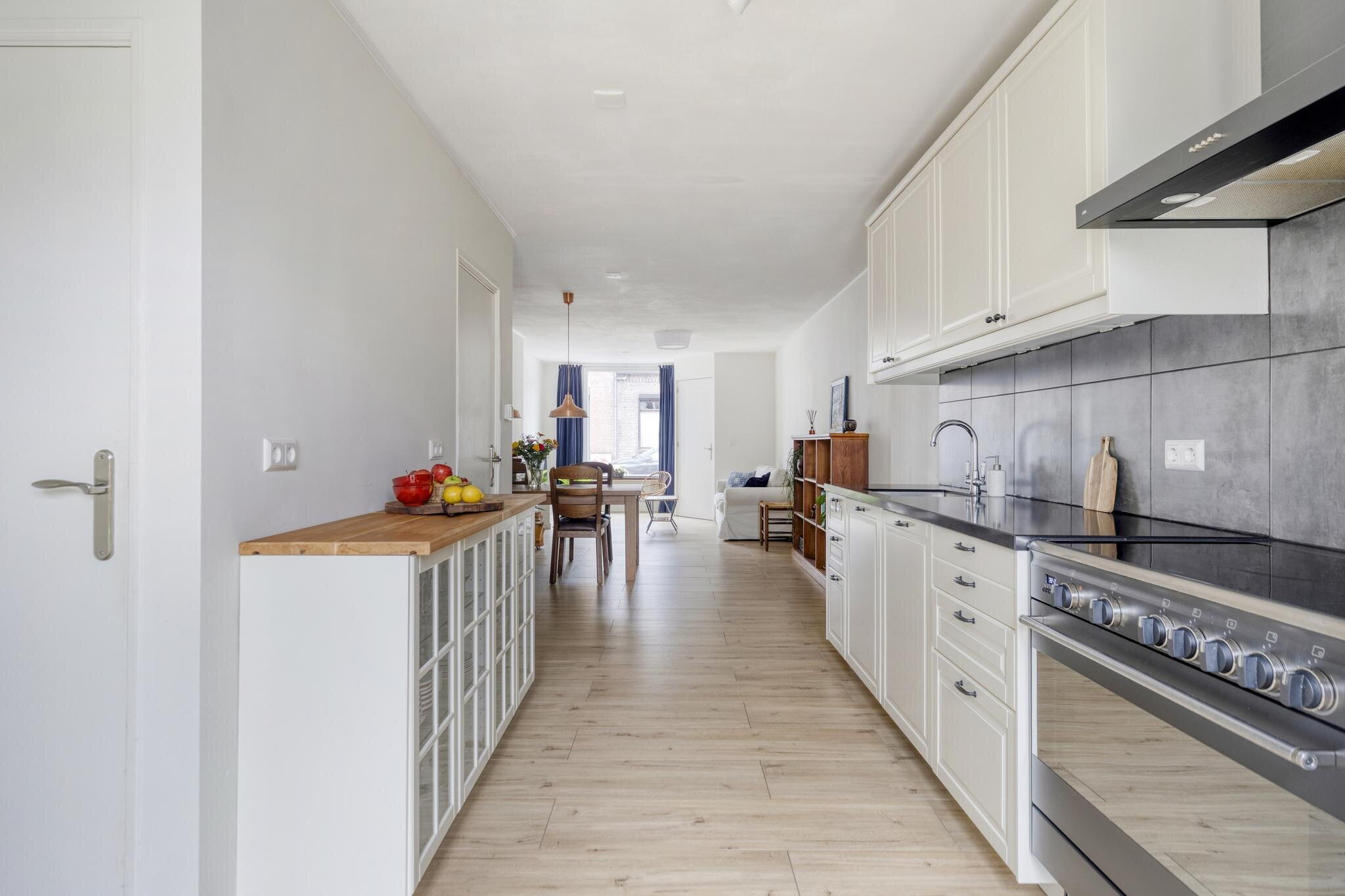 De woonkamer is een heerlijke plek om thuis te komen. Dankzij de lichte vloer, witte muren en grote raampartijen baadt deze ruimte in het daglicht. De gezellige schouw voegt karakter toe en de indeling maakt het eenvoudig om een comfortabele zithoek én eethoek te creëren. Aansluitend vind je de open keuken met witte kastjes, grijze tegels, en complete inbouwapparatuur. Hier kook je met plezier – en met zicht op de tuin. Extra handig: een trapkast voor extra opbergruimte én een deur naar de tuin. Via de keuken bereik je ook een gang met het toilet en een tweede deur naar buiten. De trap naar boven is slim weggewerkt achter een deur.
