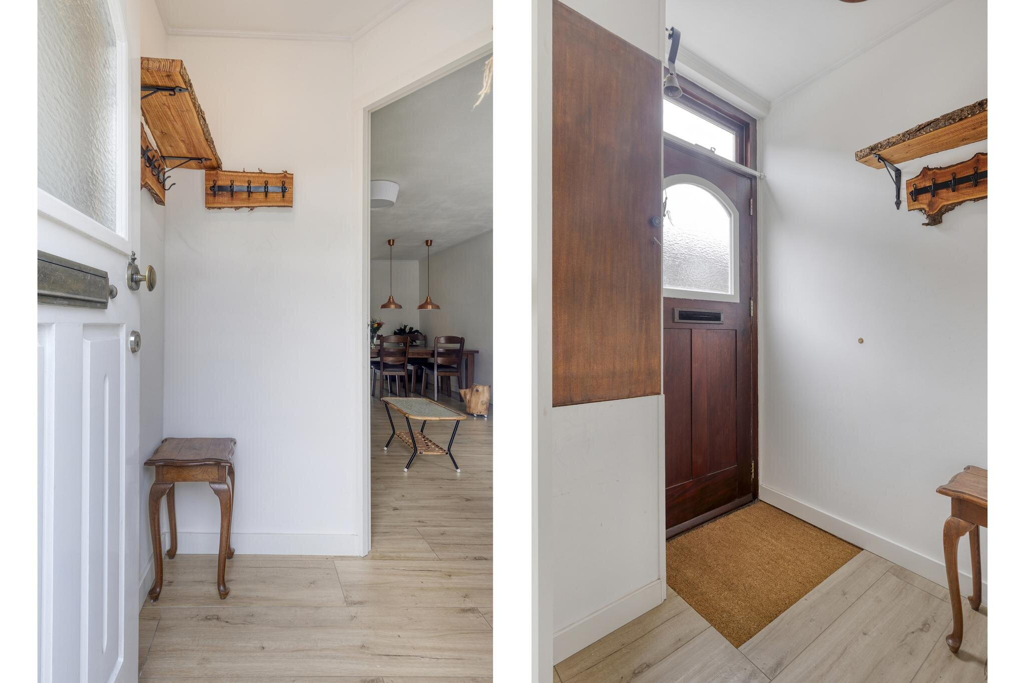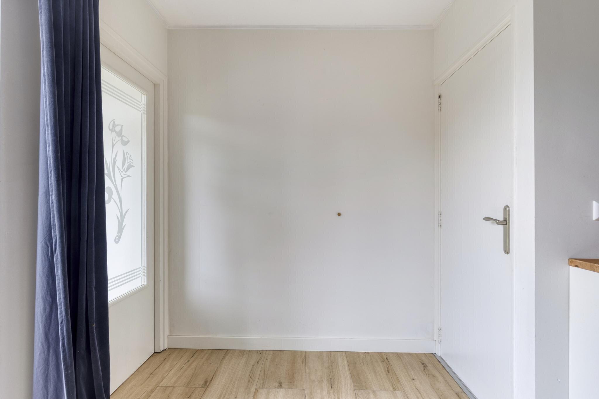 Je parkeert gemakkelijk voor de deur en stapt via een bescheiden hal met meterkast zo de woning binnen. Vanuit hier heb je direct toegang tot de woonkamer – dat voelt meteen uitnodigend.