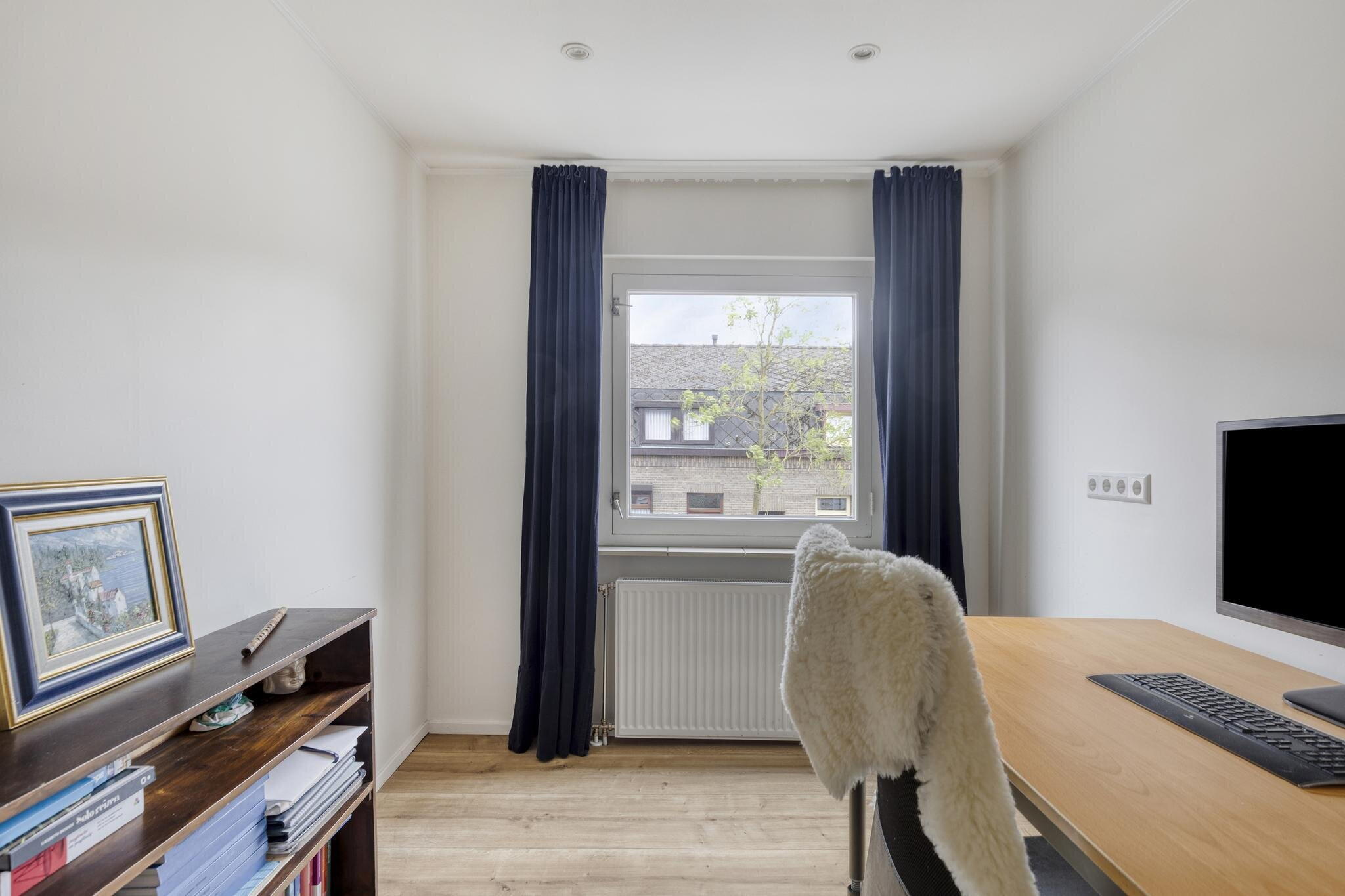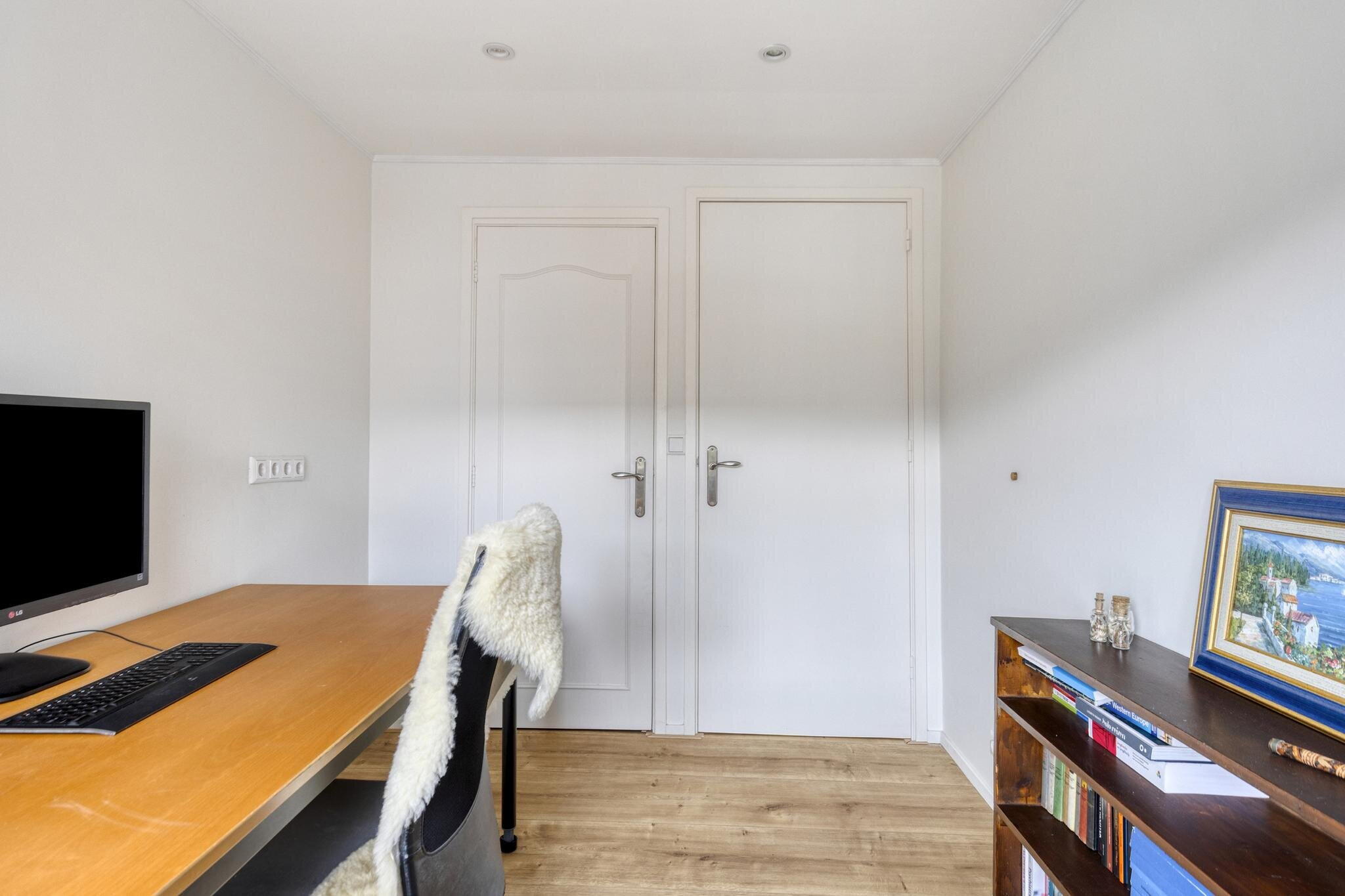 De eerste verdieping telt drie lichte en strak afgewerkte slaapkamers. De master bedroom is verrassend ruim – een echte luxe! De andere twee kamers zijn perfect als kinderkamer, logeerkamer of thuiskantoor. Eén van de kamers beschikt zelfs over een inbouwkast. De badkamer is royaal opgezet en van alle gemakken voorzien: een ligbad, een inloopdouche, toilet en wastafel, allemaal keurig betegeld en netjes afgewerkt.