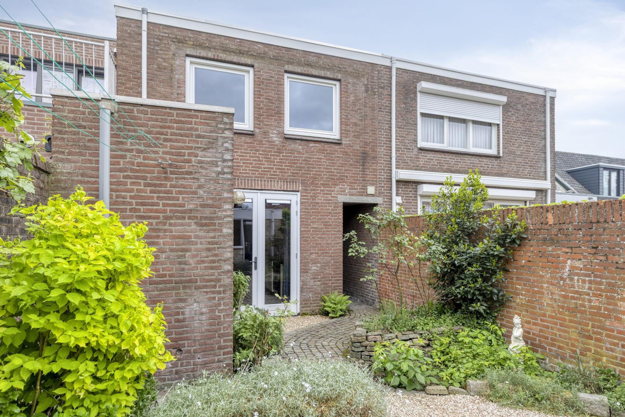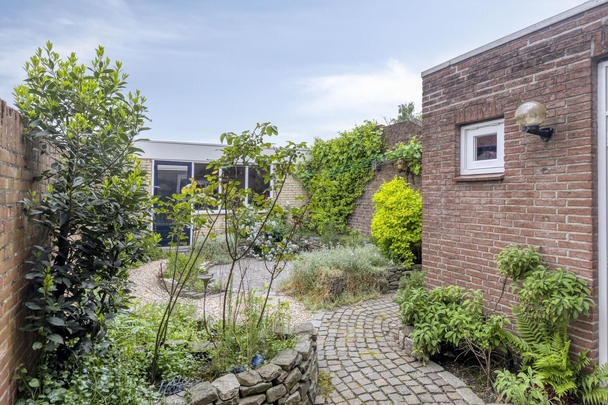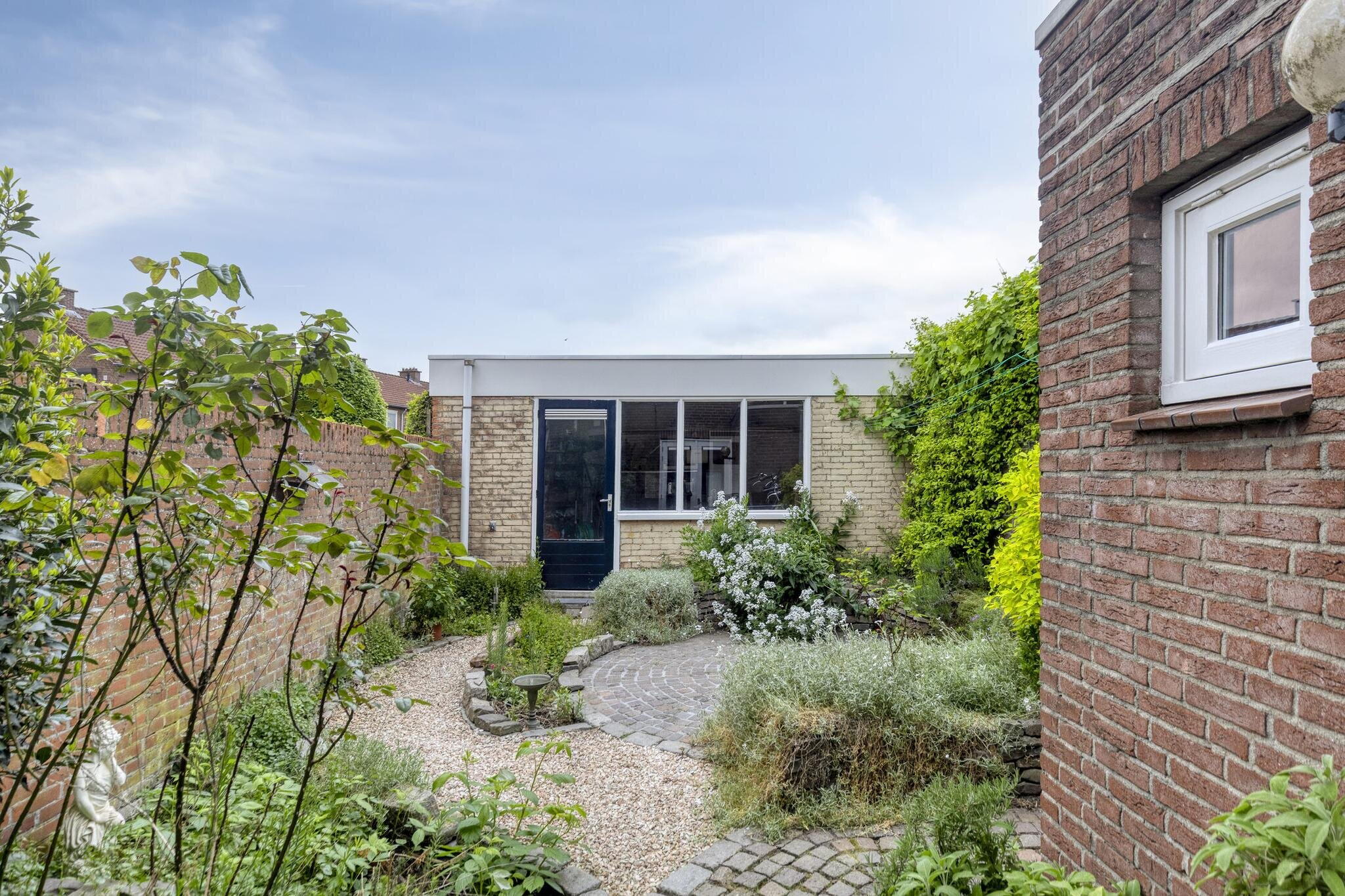 Naast de voordeur bevindt zich een poort naar een lange gang richting de achtertuin. De tuin zelf is een fijne mix van bestrating en groen, met een lekker terrasje voor je lounge- of tuinset. Achterin de tuin staat een praktische berging met aansluitingen voor wasmachine en droger – lekker praktisch!
