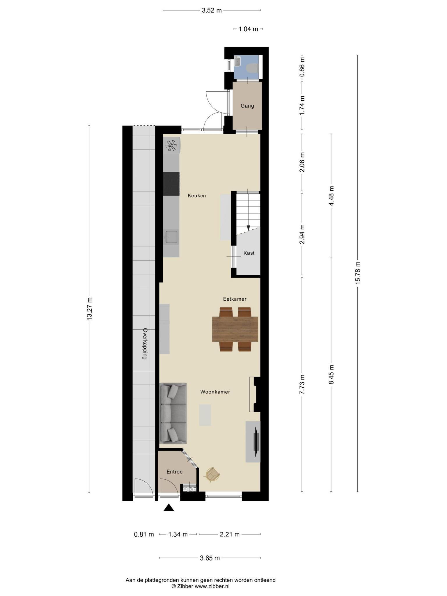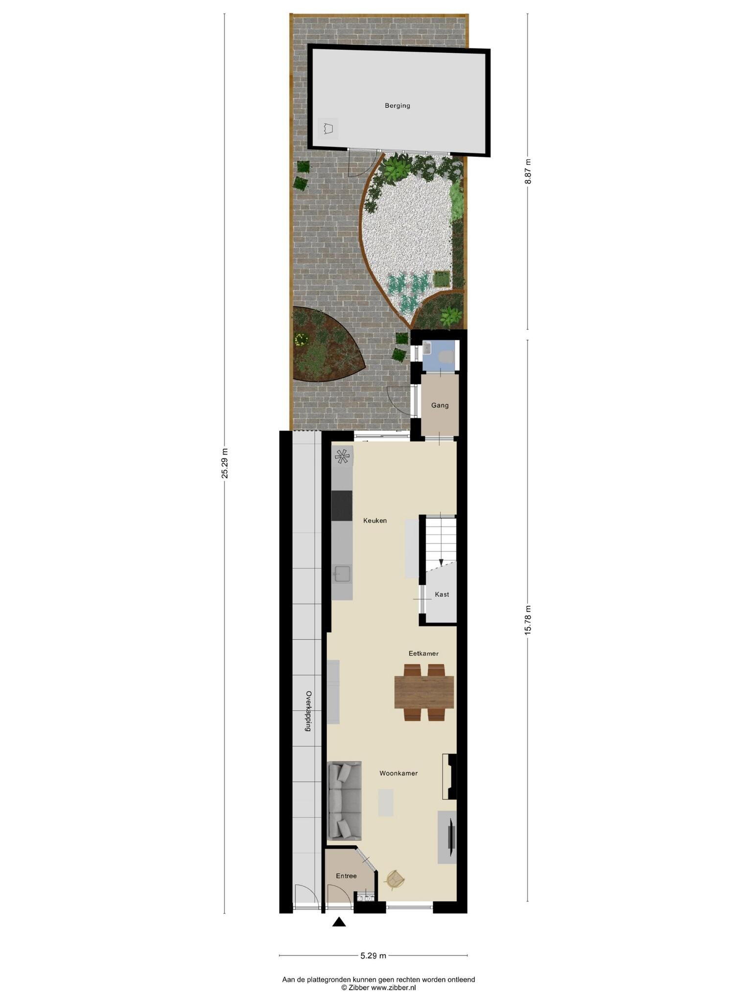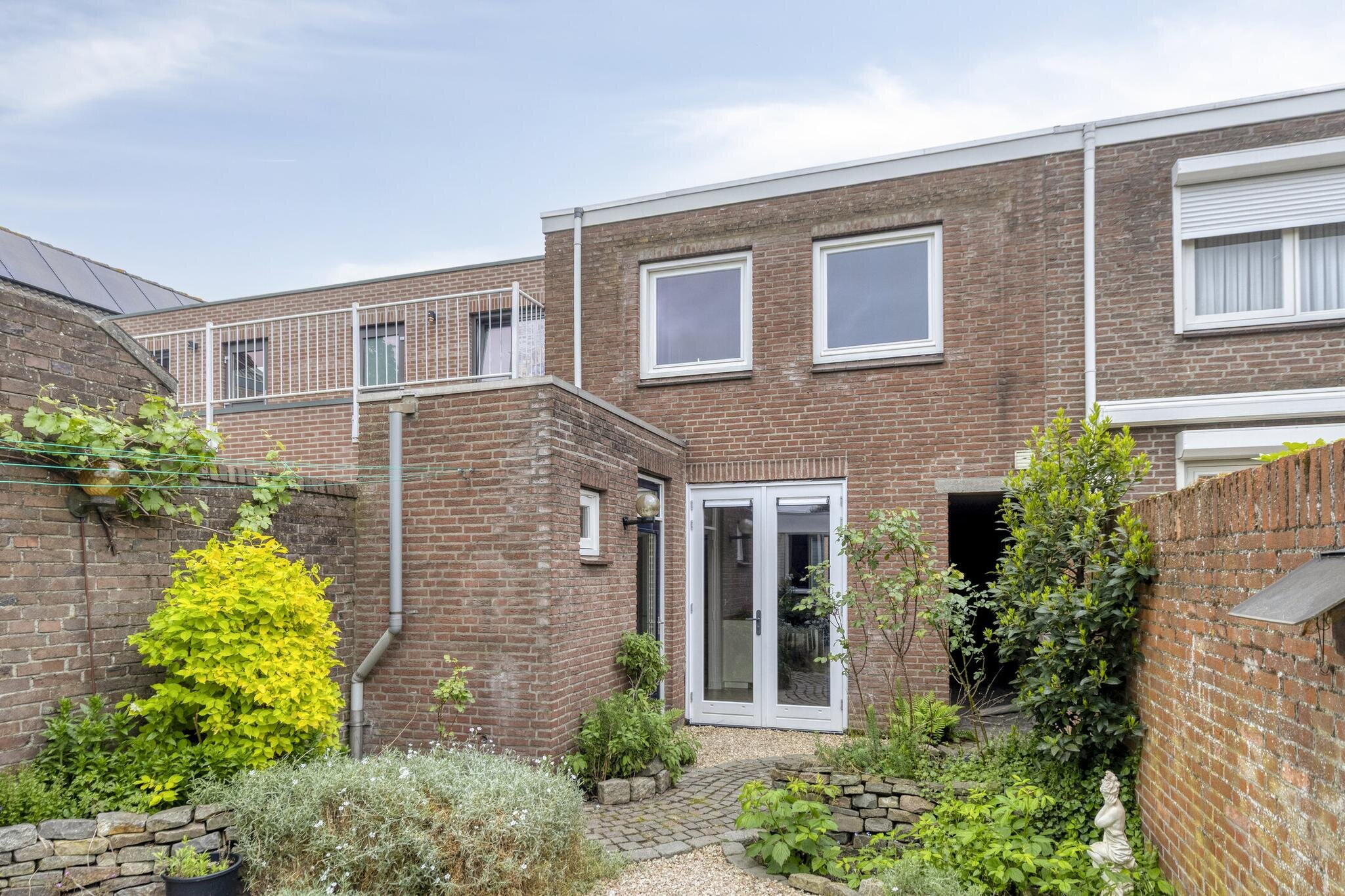 Naast de voordeur bevindt zich een poort naar een lange gang richting de achtertuin. De tuin zelf is een fijne mix van bestrating en groen, met een lekker terrasje voor je lounge- of tuinset. Achterin de tuin staat een praktische berging met aansluitingen voor wasmachine en droger – lekker praktisch!